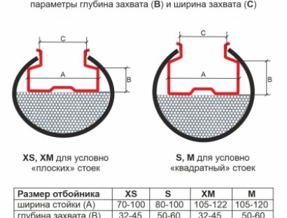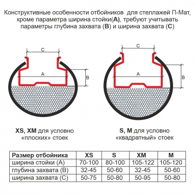 Конструктивные особенности отбойников для стеллажей П-Мат, кроме параметра ширина стойки (А), требуют учитывать параметры глубина захвата (В) и ширина захвата (С).